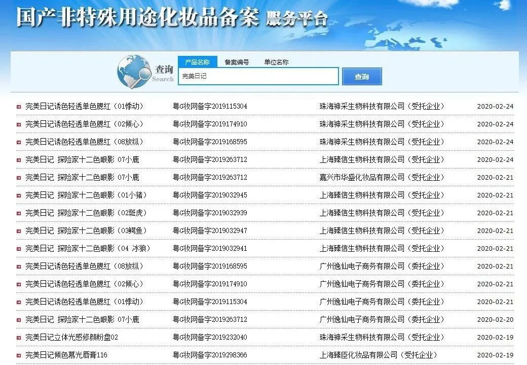 正在查阅了国家化拆品立案数据后,我发现完满日记从2017年到2020年一共立案了近千个SKU,我大要潦草看了下,应当都是代工厂消费的。